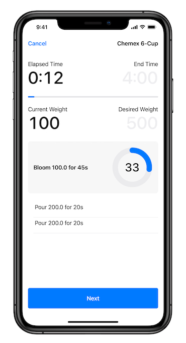 Start your timer and track bloom and pour stages. Weight is tracked so you can make a consistent cup of delicious coffee.